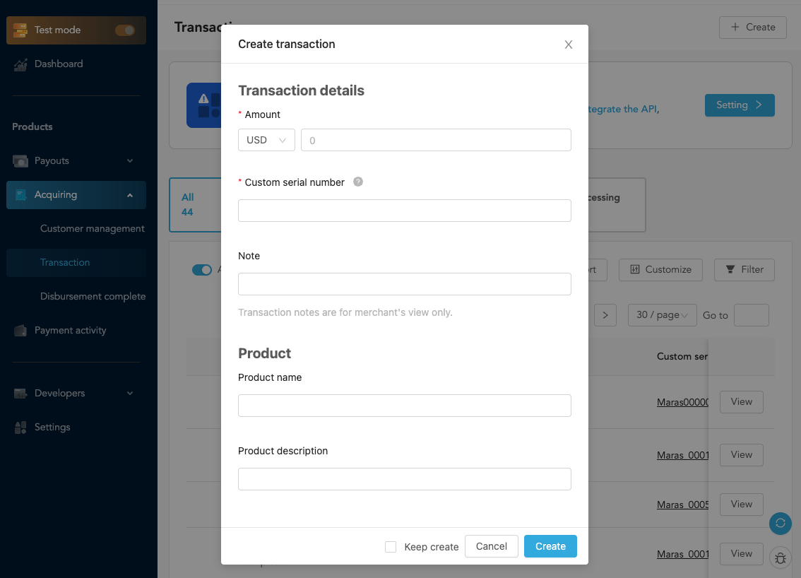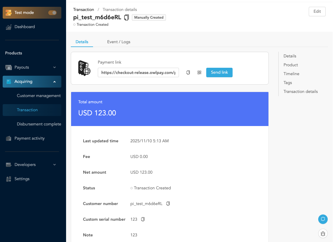 Method #2: Create a payment intent (Transaction) Owlpay Platform UI