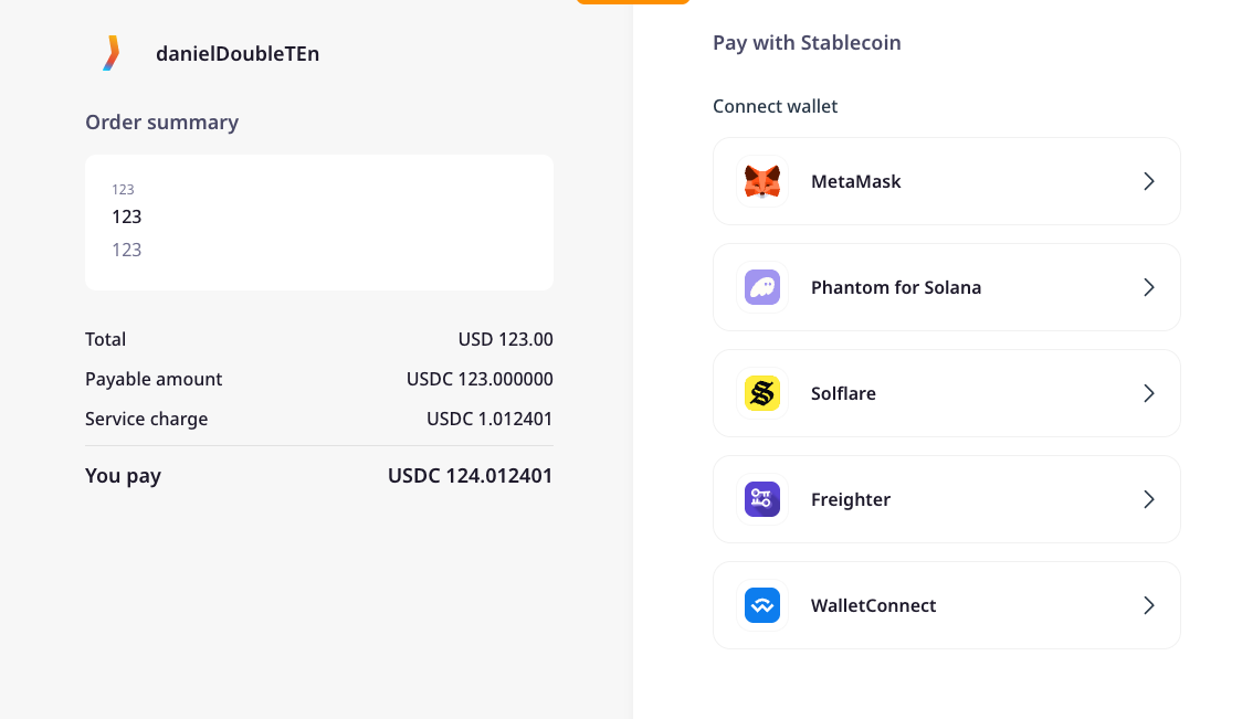 Upon opening the link your customer will see our options for stablecoin checkout as shown above in the screenshot above from Method #1 (API)!